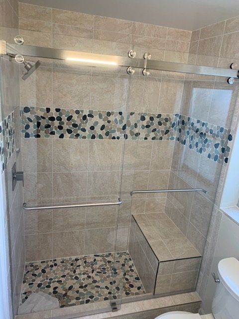 Like the Splash Guard style and the By-Pass, Frameless Double Sliding Shower doors are a great alternative to shower curtains. Not only do they let in more light, opening up your bathroom, they can be easier to maintain than shower curtains that tend to build up soap scum and other contaminants that are difficult to remove. The glass we install is treated with DFI, a protective coating that makes the glass easier to clean and maintain. A damp cloth is usually all that is necessary to keep up the clean and clear appearance. To learn more about DFI, please